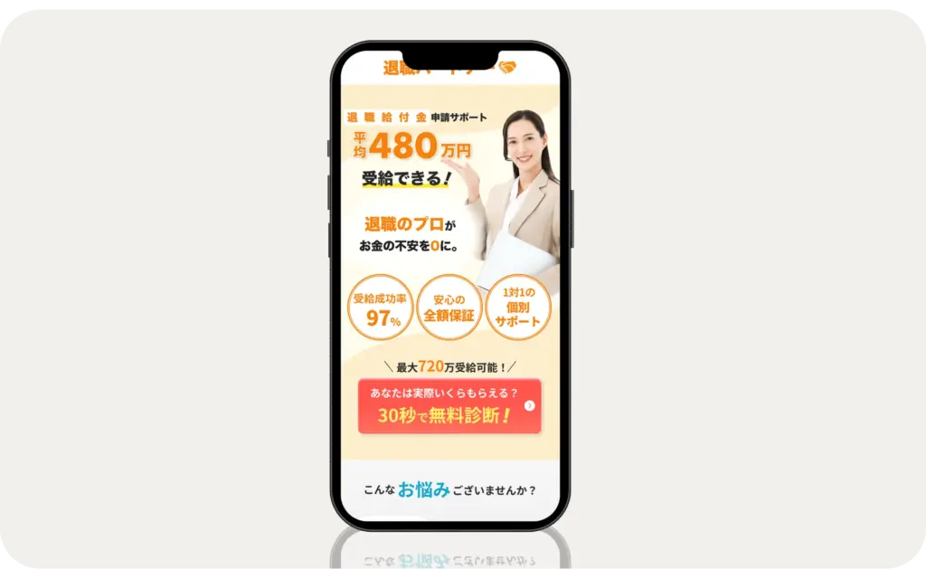 退職給付金の申請を検討している方向けに、まずは最大480万円の給付金が受け取れる可能性をファーストビューでしっかりと伝え、興味を引く構成にしています。 「30秒無料診断」への導線は、目を引くようアニメーションを施して、視線が集まりやすいデザインにしました。 全体のデザインは、退職後の不安を少しでも和らげられるよう、暖色を基調に安心感と親しみやすさを意識。 イラストやアニメーションも適度に取り入れ、申請ハードルを感じさせない、柔らかさと分かりやすさの両立を意識しました。 年代を問わず、どなたでもスムーズに読み進められるような構成とトーンを心がけています。