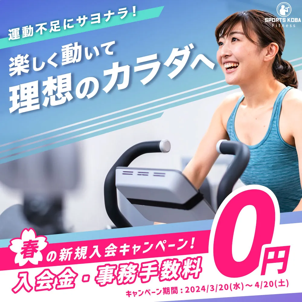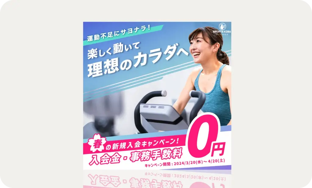 「入会金・事務手数料0円」を目立たせて配置し、運動に不安のある方にも安心感を持ってもらえるようなキャッチコピーを添えました。斜線や傾きで動きを出しつつ、春だけの印象にならないようキャンペーンにはピンク、それ以外は爽やかな色合いでまとめています。
